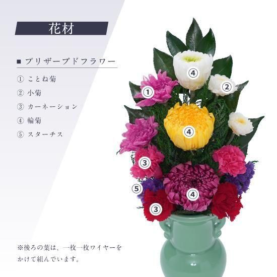 プリザーブド加工を施した花のみを使用し、まるで生花のようにつややかな仏花です。