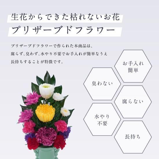 花材にこだわったプリザーブドフラワー仏花は、生花のようにみずみずしいまま長持ちします。