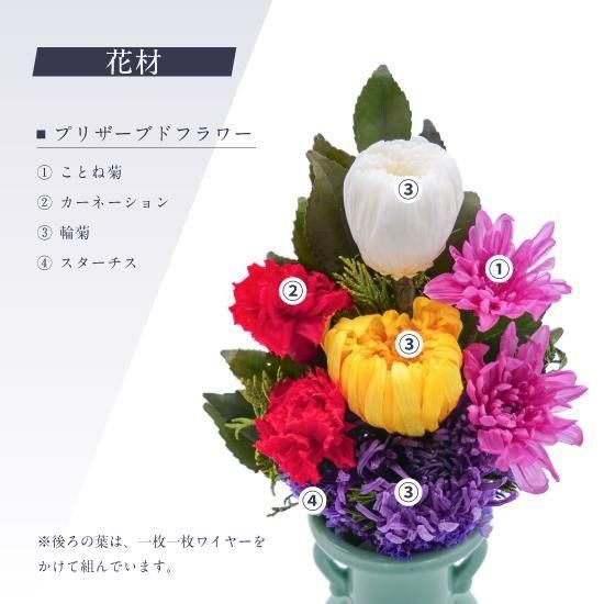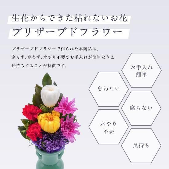 花材にこだわったプリザーブドフラワー仏花は、生花のようにみずみずしいまま長持ちします。